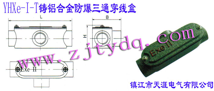 防爆電器 >> 防爆穿線盒 >> YHXe-I-T鑄鋁合金防爆三通穿線盒 AL-alloy Anti-explosion Pull Box of Tee Type 說明: 1、適用范圍: 爆炸性氣體混合物危險場所:1區(qū)、2區(qū) Danger places with gas mixture:Zone 1&2 爆炸性氣體混合物:IIA、IIB、IIC Explosive gas mixture: IIA、IIB、IIC 溫度組別:T1-T6 Temperature group:T1-T6 戶內(nèi)、戶外 indoor,outdoor 2、產(chǎn)品特點: 外殼采用鑄鋁合金,表面噴塑 The closure is made of Cast Aluminum alloy with the surface painting 如需要變徑時可特制 It can be fabricated according to the special requirements 防爆標志:ExeII Explosion-proof Mark:Exe II 防爆等級:IP55 Protection Grad:IP55 結(jié)構(gòu)形式多樣,便于安裝 Many kinds of structures are convenient for installation 3、YHXe防爆穿線盒根據(jù)客戶的要求,在不同的使用場所可選擇一下三種型號:There are three specifications for different purposes 1)、YHXe-I鑄鋁合金防爆穿線盒 YHXe-I Explosion-proof Box of Cast Aluminum Alloy 2)、YHXe-II鑄鐵防爆穿線盒 YHXe-II Explosion-proof Box of Cast Iron Alloy 3)、YHXe-III鑄鋼防爆穿線盒 YHXe-III Explosion-proof Box of Cast Steel Alloy